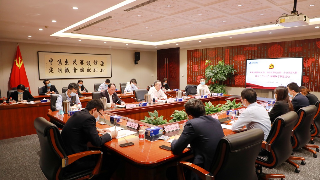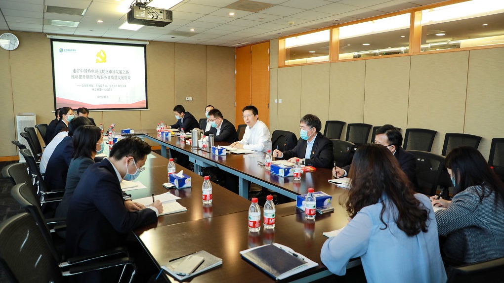 2022年11月,郑商所基层党组织开展学习党的二十大精神联学联建活动,图为党委书记、理事长熊军和党委副书记、总经理鲁东升参加支部学习讨论