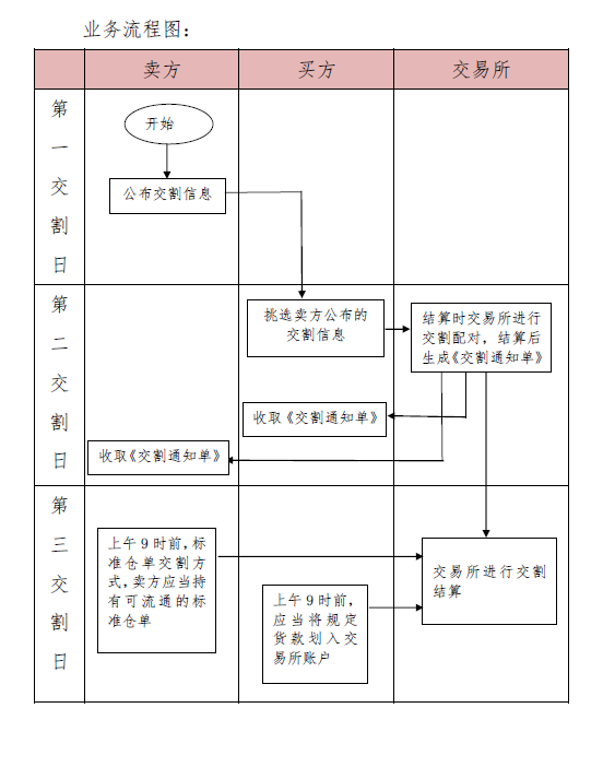4.第三交割日上午9时之前,买方会员应当将规定货款划入交易所账户,标准仓单交割的卖方会员应当持有可流通的标准仓单。交易所于第三交割日上午9时30分进行交割结算。