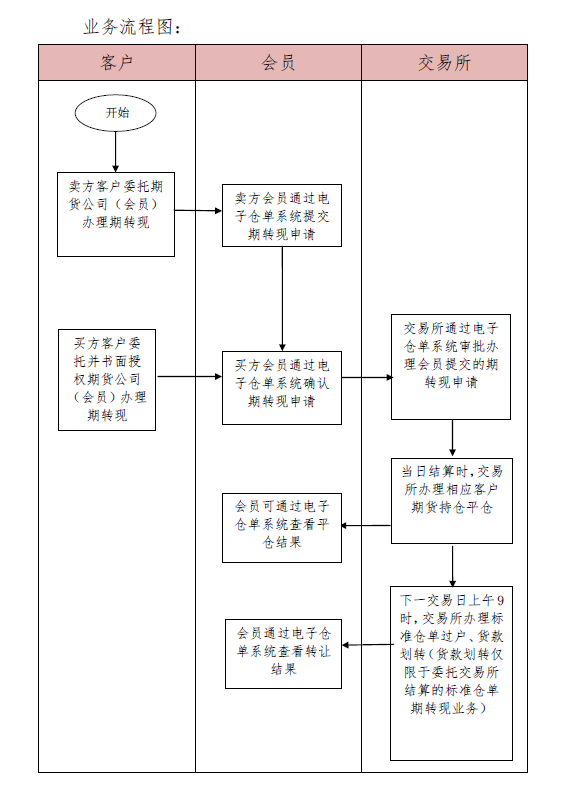 4.非标准仓单期转现业务流程同标准仓单期转现业务流程,区别是卖方提交申请时需上传现货买卖协议,货物交收和货款划转方式由买卖双方自行协商确定。