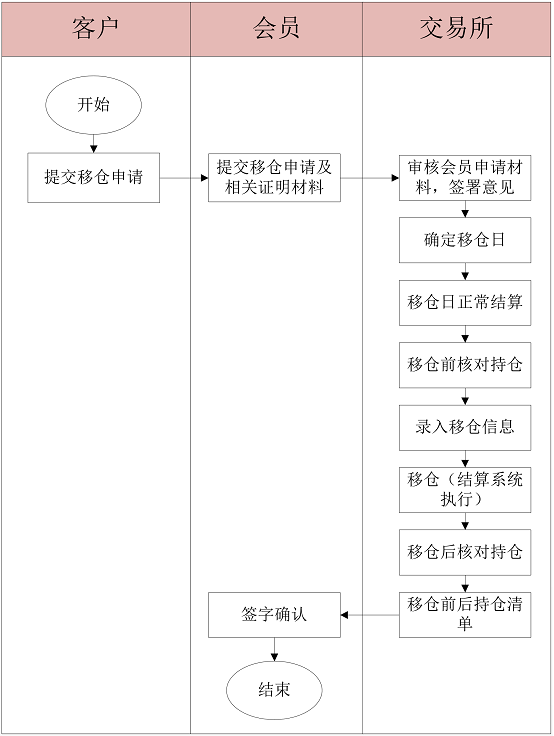 需由双方期货公司会员和客户提出书面申请,申请需要双方签字盖章,经交易所批准后,由交易所、会员和保证金监控中心共同确定某一交易日为移仓日,移仓日结算后交易所进行移仓操作。
