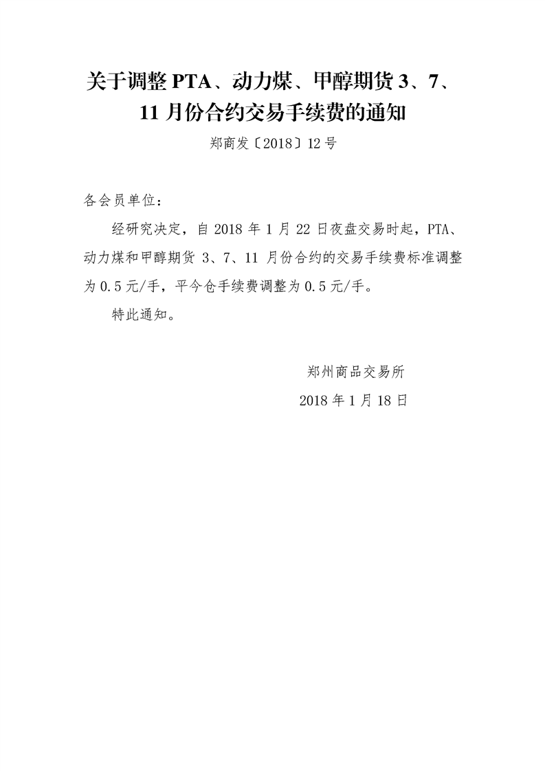 关于调整PTA、动力煤、甲醇期货3、7、11月份合约交易手续费的通知