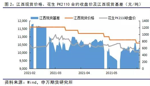 除了压榨国产菜籽生产出小榨浓香菜籽油,企业还采购进口散装菜油,用于中包装。当地还有其他油脂贸易商,在日常经营中,企业发现竞争方的报价总是比自己的报价低,而且有时还会低于企业自己的成本价,在跟太平洋证券营业部交流中得知油脂期货套保功能,营业部负责人联系申万期货去进行油脂行情路演。此前也有其他期货公司为该企业培训,但是相关领导最终没有理解期货保值功能,经过本次路演,企业终于明白为什么竞争对手价格比自己便宜,希望今后采用油脂期货降低采购成本,并在合适的时机为库存保值。申万期货也为企业定制了油脂套保方案。刚开始因为油脂处于单边上涨行情,企业尝试在采购进口菜油上做买入套保,采用后为企业显著降低采购成本。一般企业在当年9月开始到次年6月期间逐步采购花生,总采购量在4万吨左右。在采购花生前,企业领导又与申万期货联系,经过行情分析以及取得相关的报告后,根据产能安排,不会立即压榨花生,最终相关负责人决定采购一口价并卖出套保,首次尝试对原计划5月中旬采购的3000吨油料米花生进行卖出套保,而花生主力合约是PK2110合约,离5月最近的也是PK2110合约。