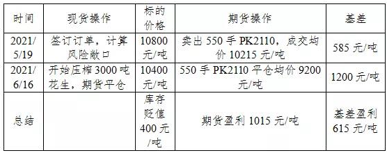 本次套保为了规避3000吨花生现货下跌的风险,理论上需要在期货市场上卖出2752吨花生,即550手花生期货PK2110合约,最终企业不仅实现货物保值,还额外收获了615元/吨的基差收益。
