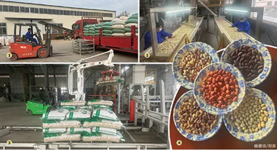 图①工人正在装卸花生 图②工人精细化筛选花生 图③机器人进行花生打包装载 图④不同品种的花生种子 田耿文/摄