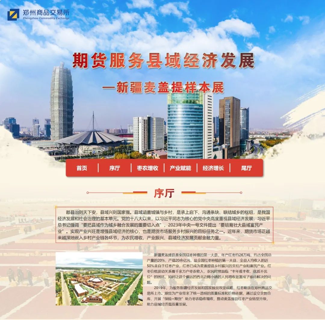 近日,为全面展示期货服务县域经济的经验历程,郑商所在官网上线“期货服务县域经济发展——新疆麦盖提样本展”网上展览馆,从枣农增收、产业赋能、经济增长三个方面全方位展示期货助力新疆麦盖提县红枣产业发展的模式和路径。(记者 陈玉静)