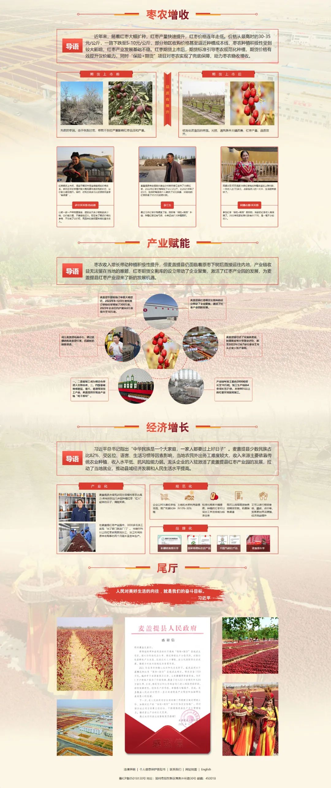 新疆麦盖提县是全国红枣种植的第一大县,年产红枣约26万吨,约占全国总产量的20%,产值20余亿元,是全国红枣种植的第一大县,全县人均收入的近50%来自于红枣产业,红枣已成为麦盖提县乡村振兴的支柱产业和富民产业。红枣价格波动关系着千家万户枣农收入,农民时常面临“丰年难丰收、优质不优价”的困扰,如何让这个偏远的西北边陲小镇的人民增收致富成了亟待解决的问题。