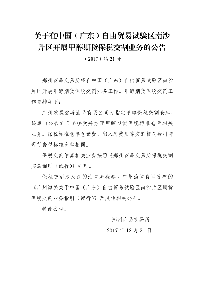 关于在中国(广东)自由贸易试验区南沙片区开展甲醇期货保税交割业务的公告