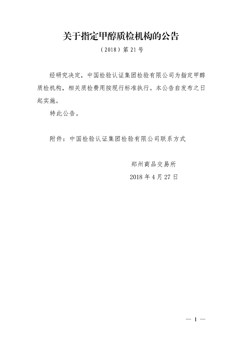 关于指定甲醇质检机构的公告