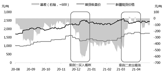 2021年3月初,在碳中和概念、内蒙古能耗双控措施以及通胀预期的影响下,甲醇价格再度冲高。企业计划在4月初向下游客户销售5000吨甲醇,售价按当时市场价,企业对当前的价格非常满意,希望锁定销售利润。基于现货库存极低和看涨预期强烈,兴业期货认为期货下跌空间有限,高位振荡的可能性更大,而5月期权即将到期,卖出MA105C2600看涨期权更适合此种情况。套保团队按照80%比例一次建仓,持有一个月后到期平仓。下图为套保损益对比,由于现货持续上涨,而期货冲高回落,现货并没有承担下跌风险,卖出看涨期权额外带来了48元/吨收益,相比做空期货进行套期保值,盘中浮亏更小,最终收益也更高。