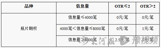 大河报·豫视频记者梳理发现,同日,郑商所公布了《关于对瓶片期权交易收取申报费的通知》,其中显示,自上市交易日起,对瓶片期权交易收取申报费。并且明确,期货品种申报费根据客户或非期货公司会员在期货合约上的报单成交比(Order to Trade Ratio,OTR)所在区间以及信息量分梯度计算。