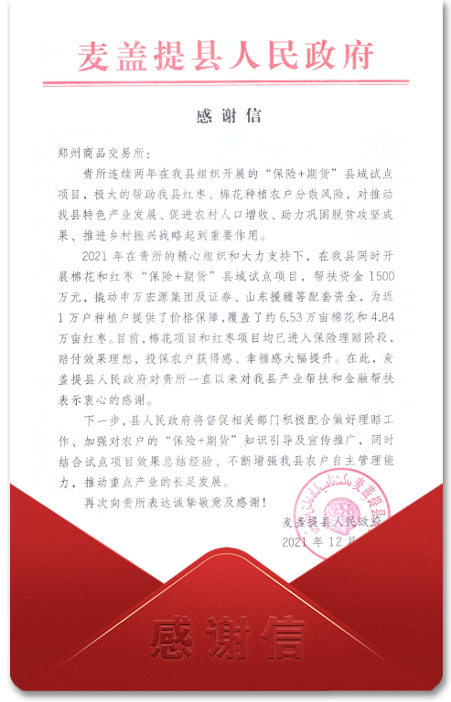 2019年,为服务新疆经济发展和国家脱贫攻坚战略,红枣期货在郑州商品交易所上市。期货为产业带来了统一透明的质量标准和价格依据,通过设立交割仓库、开展“保险+期货”助力枣农稳收增收,推动麦盖提县红枣产业转型升级,助力县域经济高质量发展。
